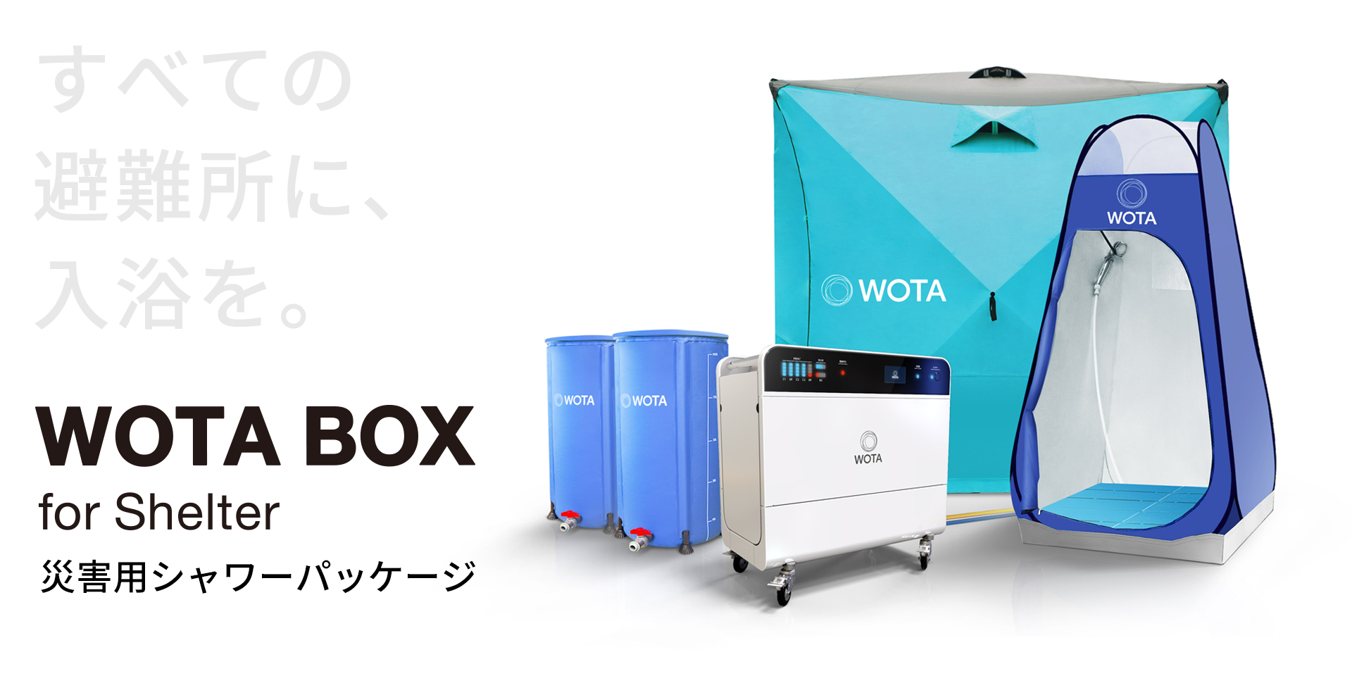 循環式シャワーはWOTA株式会社が開発したものです。WOTA株式会社がWOTA BOX for Shelterを2セット、北良が灯油式可搬給湯器2セットとホンダ製LPガス発電機を千葉県多古町に無償提供し、停電し断水している被災者にシャワーを利用していただきます。WOTA BOXは最先端のAI水処理技術によって、一度使った水の98%以上が再利用できます。シャワーを浴びると 1人あたり40〜50Lの水を使いますが、WOTA BOXは100Lの水で100人以上の方にシャワーを届けることができます。